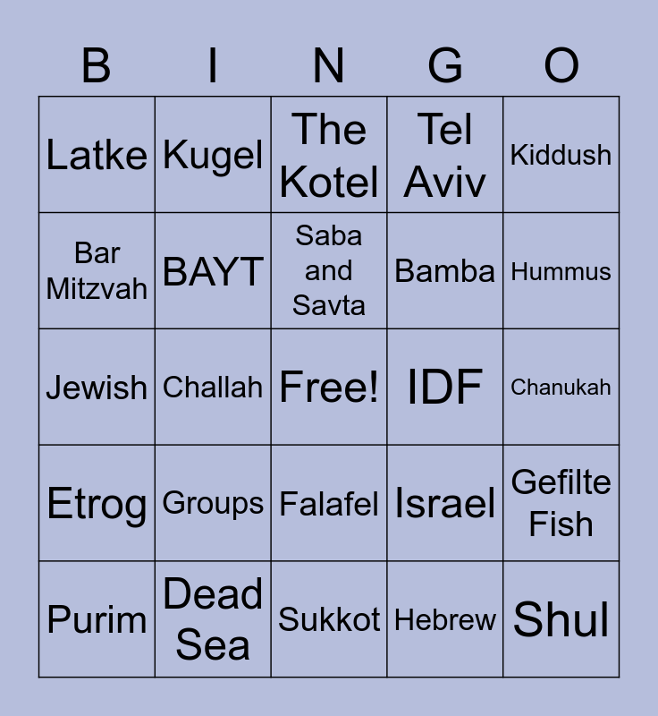 This bingo card has a free space and 29 words: Purim, Lulav, Challah, Shalom, Latke, The Kotel, BAYT, Groups, IDF, Dead Sea, Chanukah, Shul, Sukkot, Hebrew, Hummus, Shwarma, Falafel, Etrog, Kiddush, Jewish, Israel, Rosh Hashana, Bamba, Bar Mitzvah, Tel Aviv, Kugel, Gefilte Fish, Saba and Savta and Abba and Imma.