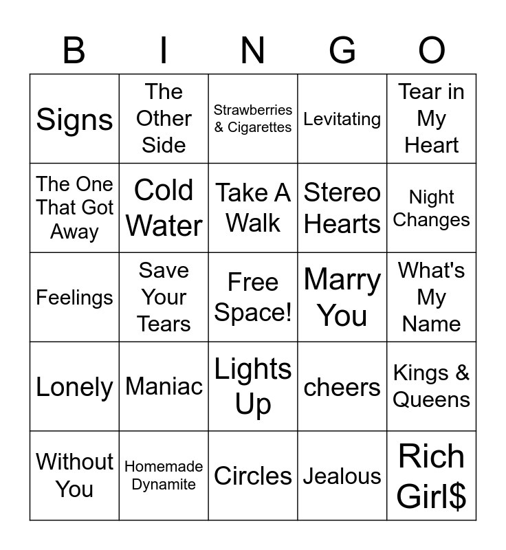 This bingo card has a free space and 24 words: Maniac, Homemade Dynamite, Take A Walk, Without You, Tear in My Heart, Signs, The One That Got Away, The Other Side, Marry You, Lights Up, Stereo Hearts, Feelings, cheers, Kings & Queens, Cold Water, Jealous, What's My Name, Strawberries & Cigarettes, Night Changes, Save Your Tears, Rich Girl$, Lonely, Levitating and Circles.