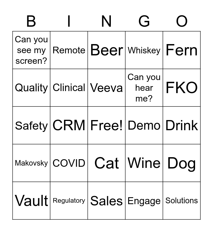 This bingo card has a free space and 24 words: COVID, Regulatory, Veeva, Vault, Fern, Can you see my screen?, Quality, Remote, Demo, Cat, Can you hear me?, Safety, Wine, Dog, Clinical, Engage, Drink, Beer, FKO, CRM, Solutions, Makovsky, Whiskey and Sales.