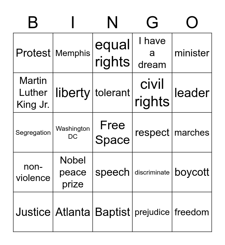 This bingo card has a free space and 24 words: Justice, Nobel peace prize, tolerant, prejudice, minister, Protest, Memphis, equal rights, respect, marches, Segregation, liberty, discriminate, boycott, Martin Luther King Jr., Atlanta, Baptist, I have a dream, leader, non-violence, Washington DC, speech, civil rights and freedom.