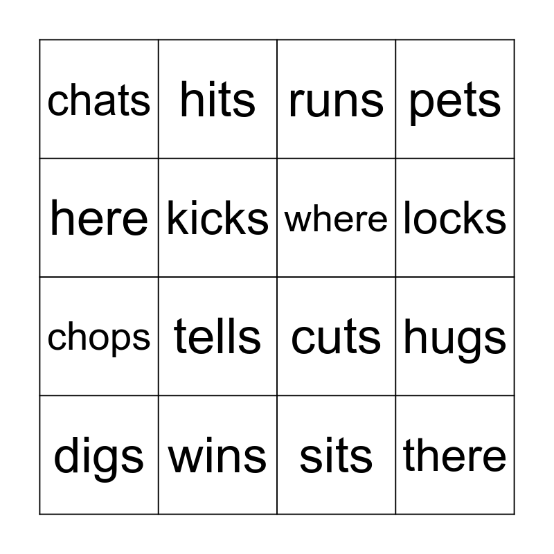 This bingo card has 16 words: wins, hugs, runs, chats, chops, hits, cuts, sits, here, kicks, digs, pets, tells, locks, where and there.