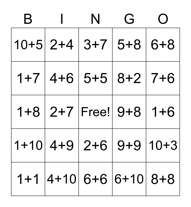 This bingo card has a free space and 56 words: 3+5, 1+1, 2+5, 10+5, 6+6, 7+8, 4+6, 9+4, 8+2, 4+4, 5+8, 2+2, 3+2, 4+3, 2+1, 3+1, 6+8, 2+7, 5+6, 8+8, 9+8, 10+10, 9+9, 3+7, 3+3, 5+5, 7+7, 7+9, 7+6, 3+6, 7+4, 7+5, 1+4, 1+5, 1+6, 1+7, 1+8, 1+9, 1+10, 2+4, 2+6, 2+9, 3+9, 4+5, 4+8, 4+9, 4+10, 2+10, 5+9, 6+9, 6+10, 8+3, 8+10, 9+10, 10+3 and 10+7.
