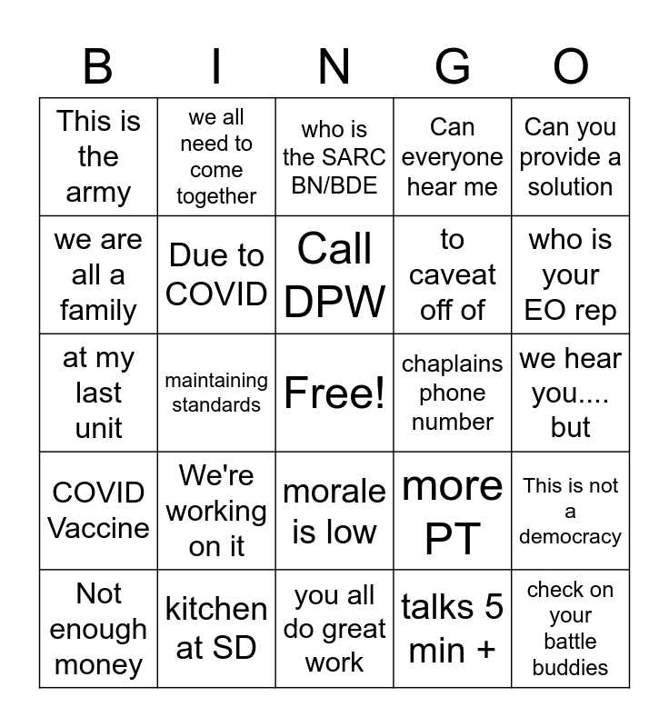 This bingo card has a free space and 24 words: We're working on it, kitchen at SD, Call DPW, Not enough money, Can you provide a solution, This is the army, we are all a family, we all need to come together, chaplains phone number, morale is low, to caveat off of, at my last unit, more PT, This is not a democracy, Due to COVID, talks 5 min +, we hear you.... but, who is the SARC BN/BDE, who is your EO rep, maintaining standards, check on your battle buddies, COVID Vaccine, Can everyone hear me and you all do great work.