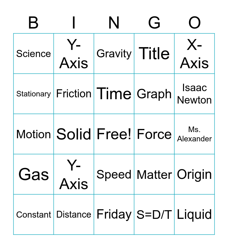 This bingo card has a free space and 24 words: Y-Axis, Distance, Time, Constant, X-Axis, Science, Stationary, Y-Axis, Force, Speed, Graph, Motion, Matter, Origin, Friction, S=D/T, Ms. Alexander, Gravity, Isaac Newton, Solid, Liquid, Gas, Title and Friday.