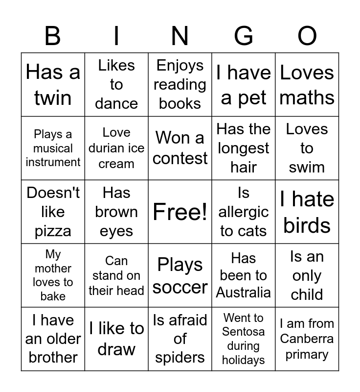 This bingo card has a free space and 24 words: I have an older brother, Can stand on their head, Won a contest, Went to Sentosa during holidays, Loves maths, Has a twin, Likes to dance, Enjoys reading books, Is allergic to cats, I hate birds, Doesn't like pizza, Love durian ice cream, Has been to Australia, Is an only child, Plays a musical instrument, I like to draw, Is afraid of spiders, I have a pet, Loves to swim, My mother loves to bake, Has brown eyes, Plays soccer, Has the longest hair and I am from Canberra primary.