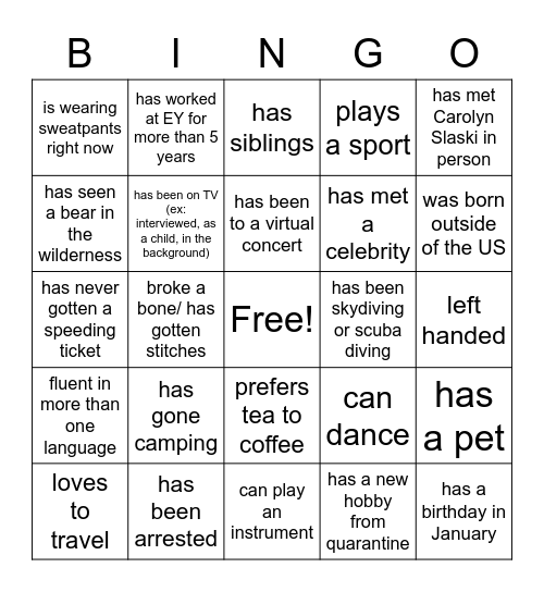 This bingo card has a free space and 24 words: has gone camping, has been arrested, has been to a virtual concert, loves to travel, has met Carolyn Slaski in person, is wearing sweatpants right now, has seen a bear in the wilderness, has worked at EY for more than 5 years, has been skydiving or scuba diving, prefers tea to coffee, has met a celebrity, has never gotten a speeding ticket, can dance, has a pet, has been on TV (ex: interviewed, as a child, in the background), has a new hobby from quarantine, left handed, has siblings, was born outside of the US, broke a bone/ has gotten stitches, has a birthday in January, fluent in more than one language, plays a sport and can play an instrument.
