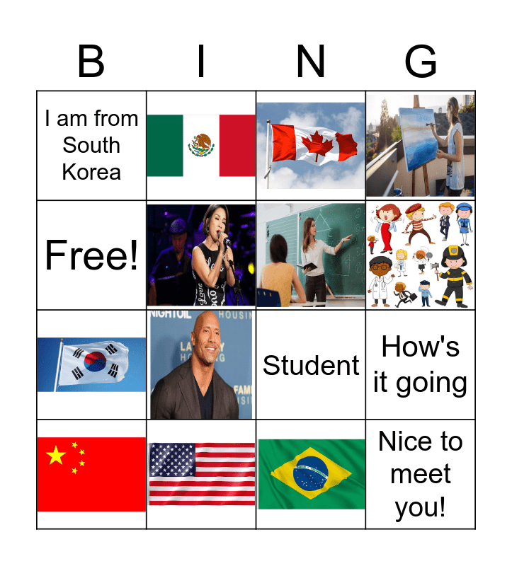 This bingo card has 11 images and 5 words: How's it going, I am from South Korea, Student, Free! and Nice to meet you!.