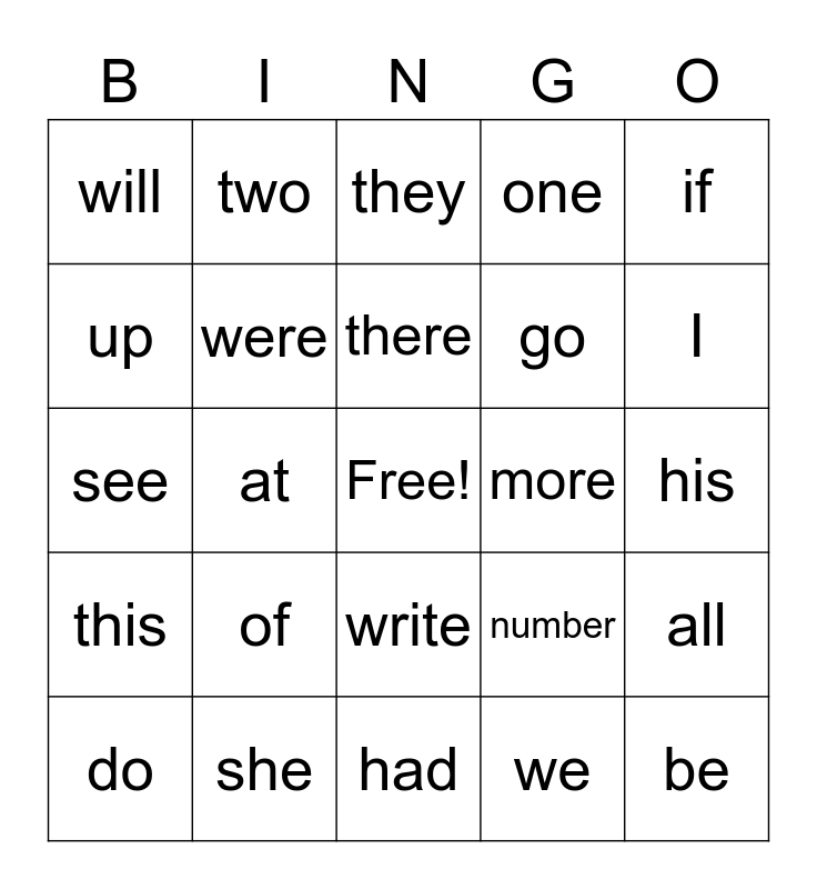 This bingo card has a free space and 24 words: of, she, there, do, if, will, up, two, more, write, go, see, number, all, were, we, his, they, I, at, be, this, one and had.