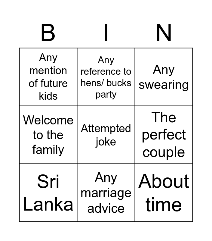 This bingo card has a free space and 12 words: The Bridesmaids look beautiful, Covid-19, About time, The perfect couple, Any reference to hens/ bucks party, Any swearing, Any marriage advice, Any mention of Kobe Bryant, Any mention of future kids, Welcome to the family, Sri Lanka and I'm going to keep this short.