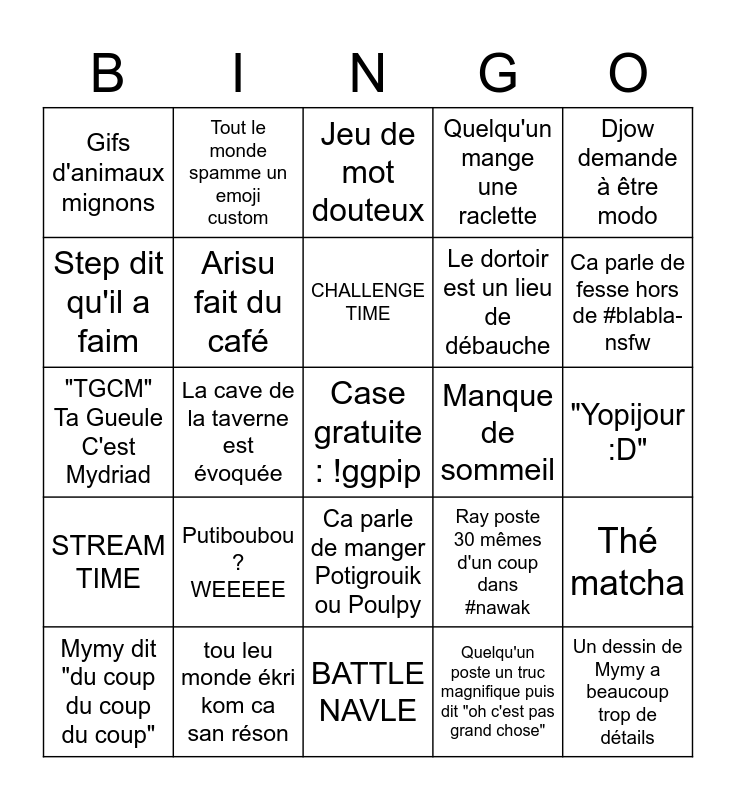 This bingo card has a free space and 24 words: Putiboubou ? WEEEEE, tou leu monde ékri kom ca san réson, CHALLENGE TIME, Mymy dit "du coup du coup du coup", Djow demande à être modo, Gifs d'animaux mignons, Step dit qu'il a faim, Tout le monde spamme un emoji custom, Manque de sommeil, Ca parle de manger Potigrouik ou Poulpy, Le dortoir est un lieu de débauche, "TGCM" Ta Gueule C'est Mydriad, Ray poste 30 mêmes d'un coup dans #nawak, Thé matcha, Arisu fait du café, Quelqu'un poste un truc magnifique puis dit "oh c'est pas grand chose", "Yopijour :D", Jeu de mot douteux, Ca parle de fesse hors de #blabla-nsfw, La cave de la taverne est évoquée, Un dessin de Mymy a beaucoup trop de détails, STREAM TIME, Quelqu'un mange une raclette and BATTLE NAVLE.
