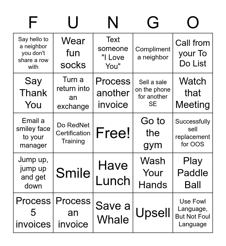 This bingo card has a free space and 24 words: Smile, Process an invoice, Process another invoice, Process 5 invoices, Call from your To Do List, Say hello to a neighbor you don't share a row with, Say Thank You, Wear fun socks, Go to the gym, Have Lunch, Sell a sale on the phone for another SE, Email a smiley face to your manager, Wash Your Hands, Play Paddle Ball, Turn a return into an exchange, Upsell, Successfully sell replacement for OOS, Text someone "I Love You", Watch that Meeting, Do RedNet Certification Training, Use Fowl Language, But Not Foul Language, Jump up, jump up and get down, Compliment a neighbor and Save a Whale.