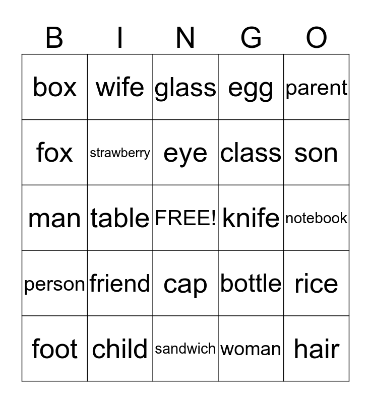 This bingo card has a free space and 24 words: friend, child, eye, foot, parent, box, fox, wife, knife, cap, class, man, bottle, rice, strawberry, woman, notebook, glass, son, table, hair, person, egg and sandwich.