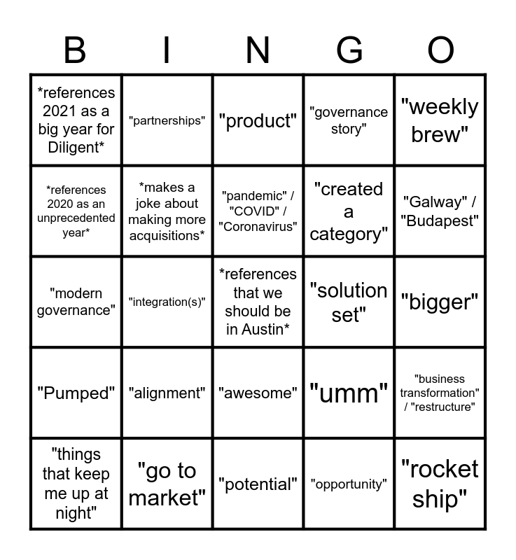 This bingo card has 25 words: "alignment", "potential", "pandemic" / "COVID" / "Coronavirus", "things that keep me up at night", "weekly brew", *references 2021 as a big year for Diligent*, *references 2020 as an unprecedented year*, "partnerships", "solution set", "awesome", "created a category", "modern governance", "umm", "business transformation" / "restructure", *makes a joke about making more acquisitions*, "rocket ship", "bigger", "product", "Galway" / "Budapest", "integration(s)", *references that we should be in Austin*, "go to market", "Pumped", "governance story" and "opportunity".