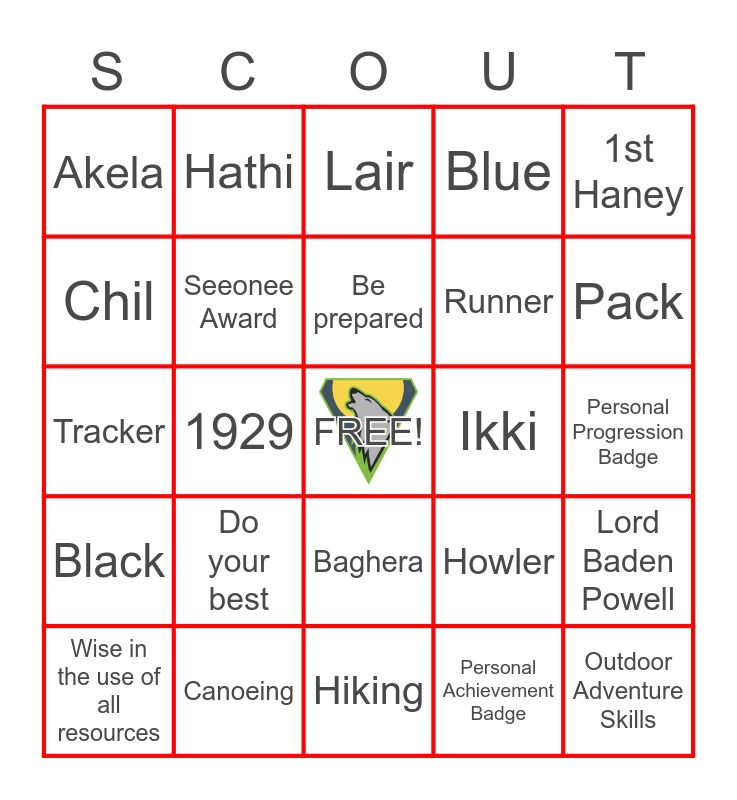 This bingo card has a free space and 24 words: Do your best, Canoeing, Be prepared, Wise in the use of all resources, 1st Haney, Akela, Chil, Hathi, Ikki, Baghera, Runner, Tracker, Howler, Lord Baden Powell, Seeonee Award, Personal Achievement Badge, Personal Progression Badge, Lair, Pack, 1929, Outdoor Adventure Skills, Black, Blue and Hiking.