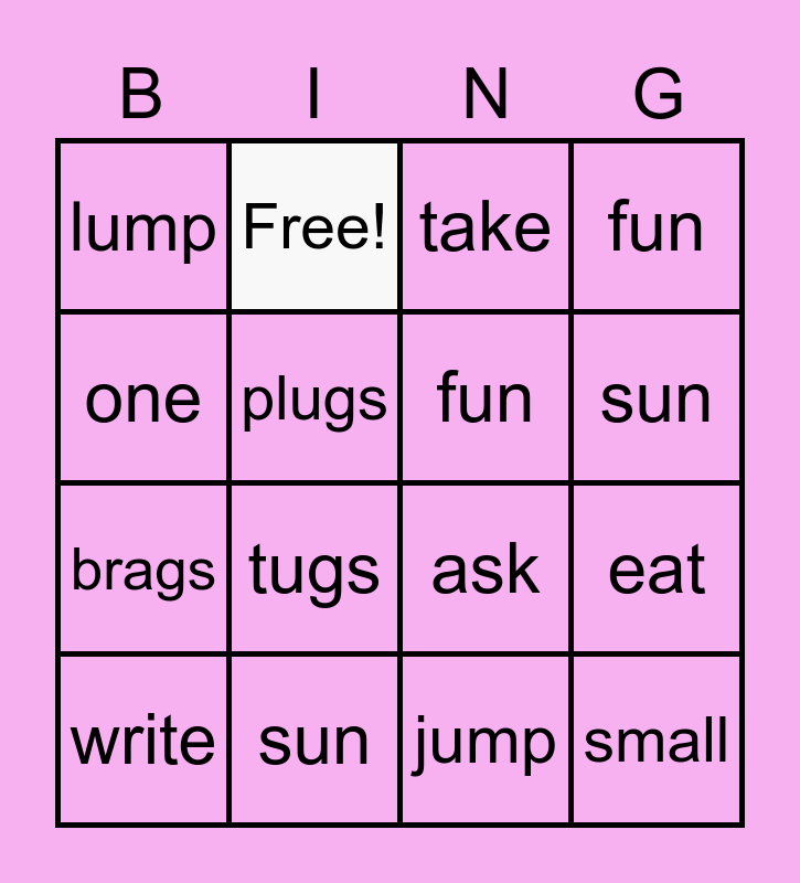 This bingo card has 19 words: ask, give, take, small, eat, one, jump, lump, Free!, brags, tugs, plugs, fun, sun, write, put, fun, sun and write.