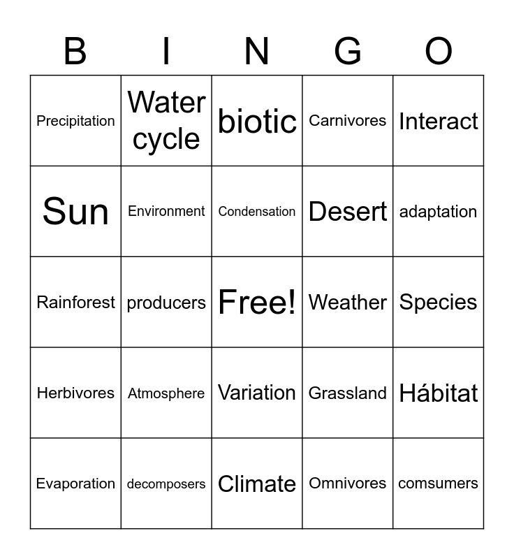 This bingo card has a free space and 25 words: Atmosphere, Climate, Condensation, Evaporation, Interact, Precipitation, Sun, Water cycle, Weather, Variation, Desert, Rainforest, Grassland, Hábitat, Environment, Ecosystem, Species, biotic, adaptation, producers, comsumers, decomposers, Herbivores, Carnivores and Omnivores.