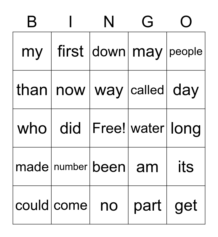 This bingo card has a free space and 25 words: number, no, way, could, people, my, than, first, water, been, called, who, am, its, now, find, long, down, day, did, get, come, made, may and part.