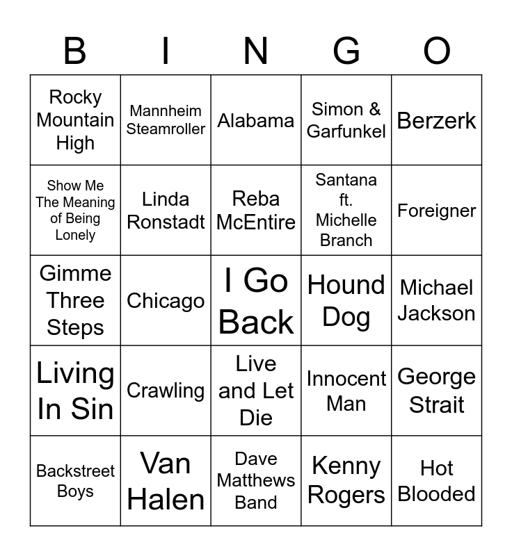 This bingo card has 98 words: Garth Brooks, Friends In Low Places, The Way You Make Me Feel, Michael Jackson, R. Kelly, Ignition (Remix), Always On My Mind, Willie Nelson, People Are Strange, The Doors, Mariah Carey, Hero, Linkin Park, Crawling, Deck The Halls, Mannheim Steamroller, Gimme Three Steps, Lynyrd Skynyrd, Fire and Rain, James Taylor, Pearl Jam, Corduroy, Wide Open Space, The Dixie Chicks, John Denver, Rocky Mountain High, Dave Matthews Band, Tripping Billies, Positively 4th Street, Bob Dylan, Backstreet Boys, Show Me The Meaning of Being Lonely, Tim McGraw (artist), Everywhwere, Foreigner, Hot Blooded, Simon & Garfunkel, Homeward Bound, Chicago, Hard To Say I'm Sorry, The Night The Lights Went Out in Georgia, Reba McEntire, Santana ft. Michelle Branch, The Game of Love, Guns N Roses, Live and Let Die, Bob Seger & The Silver Bullet Band, The Fire Inside, Refugee, Tom Petty & The Heartbreakers, Boston, More Than a Feeling, Womanizer, Britney Spears, Alan Jackson, Chattahoochee, Living In Sin, Bon Jovi, 2Pac, Dear Mama, Love in an Elevator, Aerosmith, Madonna, Lucky Star, Where Do Broken Hearts Go, Any Way You Want It, Journey, Whitney Houston, Taylor Swift, Tim McGraw (song), Alabama, Mountain Music, Kenny Rogers, The Gambler, Brother Loves Traveling Salvation Show, Neil Diamond, NSYNC, Bye, Bye, Bye, Kenny Chesney, I Go Back, Poor Poor Pitiful Me, Linda Ronstadt, Van Halen, Why Can't This Be Love, Metallica, Wherever I May Roam, Bruce Springsteen, Better Days, George Strait, Ocean Front Property, Billy Joel, Innocent Man, Take It To the Limit, Eagles, Hound Dog, Elvis Presley, Berzerk and Eminem.