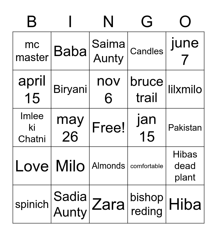 This bingo card has a free space and 52 words: zoya, Hiba, Isma, Zara, Milo, Mama (Birthday!), Baba, april 5th, april 15, Garlic bread, Biryani, Pot lights, Hibas dead plant, comfortable, apple pie, birthday, nov 6, jan 15, march 11, june 7, may 26, bishop reding, mc master, bruce trail, toe beans, BBQ chicken, Pizza Pop, custom trio, lilxmilo, fancy feast, Cake, Candles, streamers, Milton, Party, Saima Aunty, Sadia Aunty, Beet Juice, Raisin Tea Biscuit, Dark roast double double, chinese food, Pakistan, Love, Balloons, Almonds, Figs, Karele, Imlee ki Chatni, COVID-19, fruit salad, spinich and HAPPY BIRTHDAY MAMA (if you have this sing when it comes).