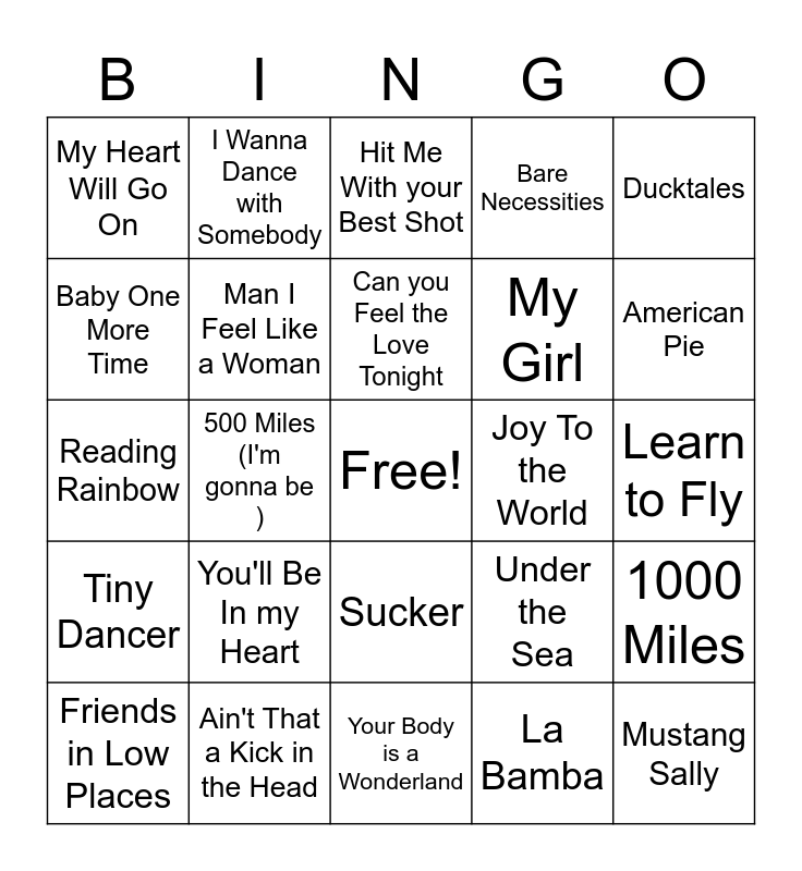 This bingo card has a free space and 24 words: You'll Be In my Heart, Ain't That a Kick in the Head, Can you Feel the Love Tonight, Friends in Low Places, Ducktales, My Heart Will Go On, Baby One More Time, I Wanna Dance with Somebody, Joy To the World, Sucker, My Girl, Reading Rainbow, Under the Sea, 1000 Miles, Man I Feel Like a Woman, La Bamba, Learn to Fly, Hit Me With your Best Shot, American Pie, 500 Miles (I'm gonna be ), Mustang Sally, Tiny Dancer, Bare Necessities and Your Body is a Wonderland.