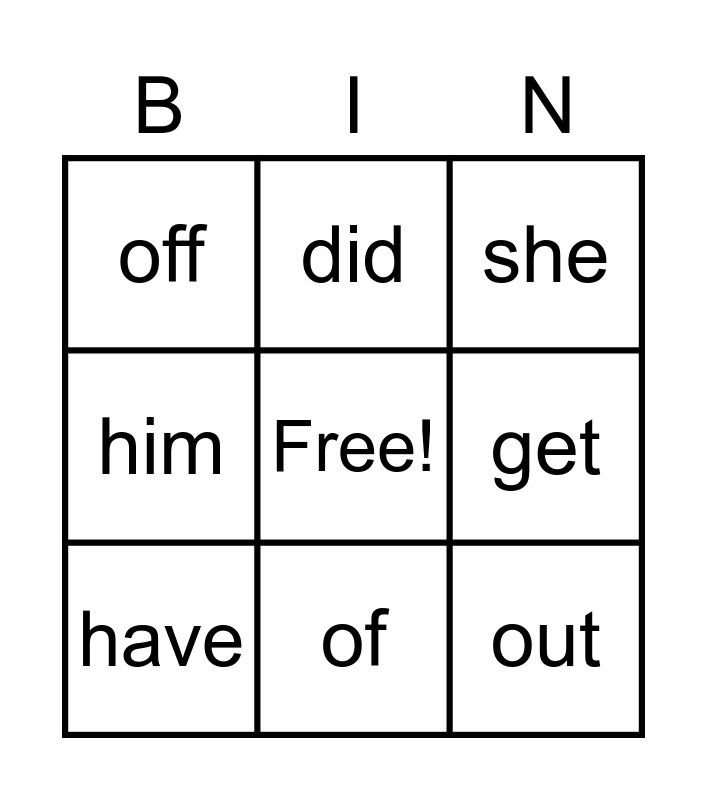 This bingo card has a free space and 8 words: get, she, did, have, off, out, him and of.