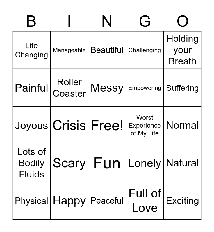 This bingo card has a free space and 25 words: Scary, Peaceful, Messy, Physical, Holding your Breath, Life Changing, Painful, Manageable, Worst Experience of My Life, Fun, Empowering, Joyous, Lonely, Natural, Roller Coaster, Intense, Normal, Beautiful, Suffering, Crisis, Exciting, Happy, Lots of Bodily Fluids, Challenging and Full of Love.