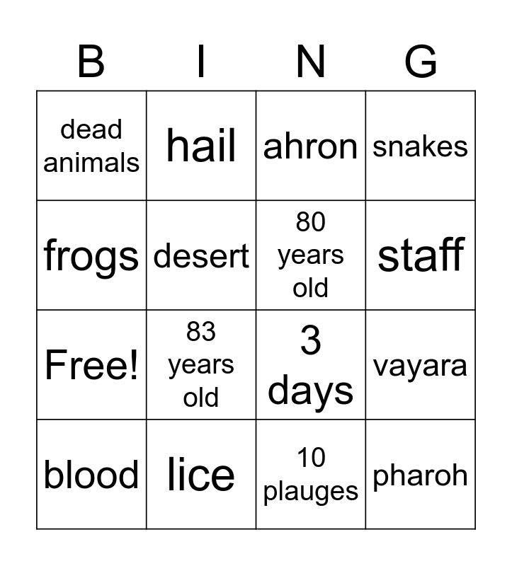 This bingo card has 20 words: vayara, moshe, ahron, macot, blood, frogs, lice, dead animals, Free!, hail, 83 years old, 3 days, desert, pharoh, 80 years old, staff, staff, snakes, 10 plauges and miriam.