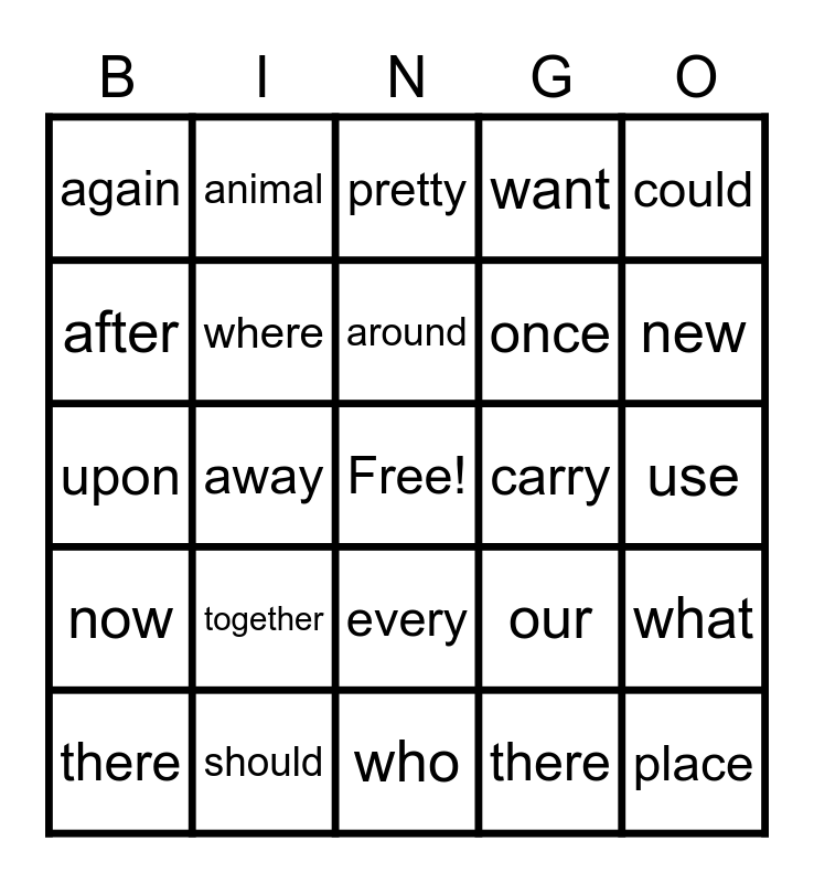 This bingo card has a free space and 24 words: together, should, around, there, could, again, after, animal, carry, every, once, upon, our, what, where, there, use, pretty, new, away, place, now, want and who.