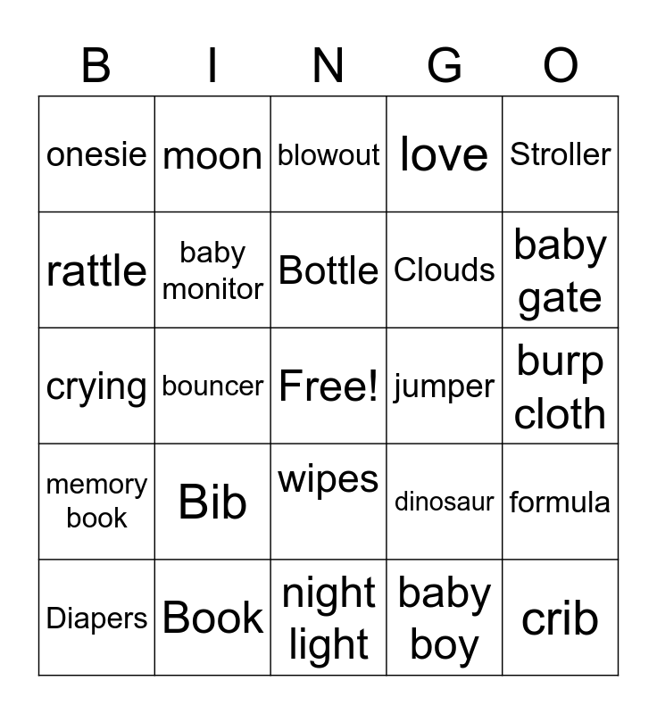This bingo card has a free space and 24 words: Bib, Book, Bottle, Diapers, Stroller, onesie, rattle, moon, jumper, wipes, Clouds, crying, dinosaur, formula, baby monitor, baby boy, burp cloth, blowout, baby gate, bouncer, crib, memory book, love and night light.