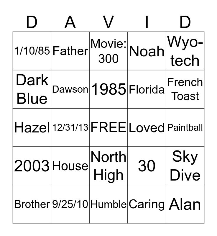 This bingo card has a free space and 24 words: House, 9/25/10, 1985, Brother, Wyo-tech, 1/10/85, Dark Blue, Father, Loved, North High, Florida, Hazel, 30, Sky Dive, Dawson, Caring, Paintball, Movie: 300, French Toast, 12/31/13, Alan, 2003, Noah and Humble.