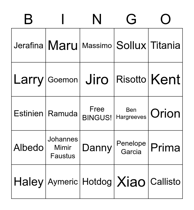 This bingo card has a free space and 24 words: Haley, Johannes Mimir Faustus, Jiro, Xiao, Titania, Jerafina, Maru, Massimo, Ben Hargreeves, Orion, Estinien, Goemon, Penelope Garcia, Prima, Larry, Aymeric, Hotdog, Sollux, Kent, Albedo, Ramuda, Danny, Risotto and Callisto.