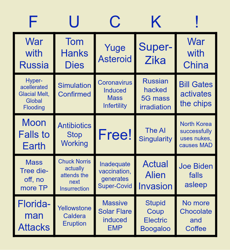 This bingo card has a free space and 26 words: Inadequate vaccination, generates Super-Covid, Stupid Coup Electric Boogaloo, Coronavirus Induced Mass Infertility, Yellowstone Caldera Eruption, War with China, War with Russia, Hyper-acellerated Glacial Melt, Global Flooding, Tom Hanks Dies, North Korea successfully uses nukes, causes MAD, Actual Alien Invasion, Russian hacked 5G mass irradiation, Moon Falls to Earth, Joe Biden falls asleep, Florida-man Attacks, Antibiotics Stop Working, Lord Bezos Ascends, Super-Zika, Mass Tree die-off, no more TP, Yuge Asteroid, No more Chocolate and Coffee, Bill Gates activates the chips, Massive Solar Flare induced EMP, The AI Singularity, Chuck Norris actually attends the next Insurrection, Simulation Confirmed and Hobbes Resurrected, Updated Terms of Service.