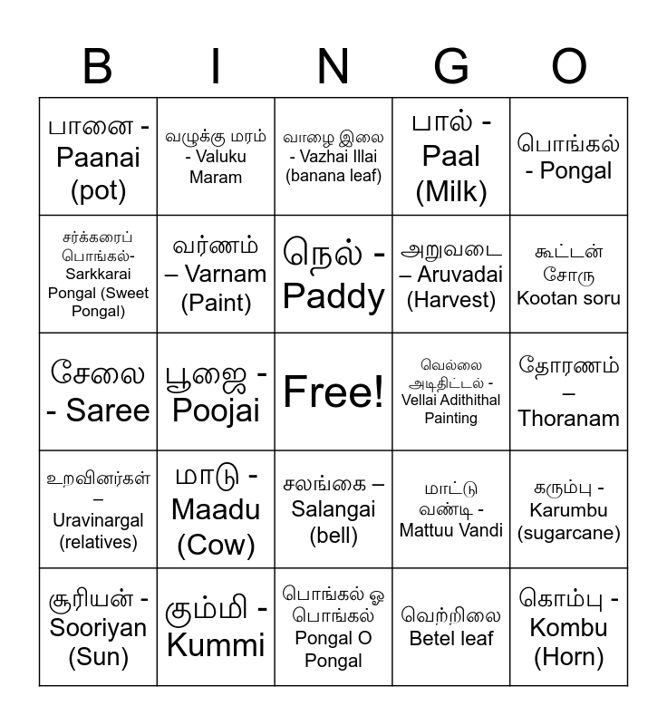 This bingo card has a free space and 70 words: மாவிலை- MaaVilai (Mango leaf), தோரணம் – Thoranam, வெல்லம் - Vellam (Jaggery), போகி - Bogi, கும்மி - Kummi, அரிசி - Arisi (Rice), பால் - Paal (Milk), விளக்கு - Vilakku (Lamp), பொங்கல் - Pongal, மாட்டு பொங்கல் - Maatu Pongal, கரும்பு - Karumbu (sugarcane), கோலம் - Kolam (Rangoli), பானை - Paanai (pot), வாழை இலை - Vazhai Illai (banana leaf), வடை - Vadai, பூஜை - Poojai, சலங்கை – Salangai (bell), அறுவடை – Aruvadai (Harvest), பருப்பு – Paruppu (Lentils), உறவினர்கள் – Uravinargal (relatives), வெல்லை அடிதிட்டல் -Vellai Adithithal Painting, மாட்டு வண்டி - Mattuu Vandi, கூட்டன் சோரு Kootan soru, ஒயில் ஆட்டம் -Oyil Aattam, மயில் ஆட்டம் - Mayil Aattam, காணும் பொங்கல் - Kaanum Pongal, ரேக்ளா ரேஸ் - Raekala Race, அலங்கநல்லூர் - Alanganallur, வெற்றிலை Betel leaf, மஞ்சு விராட்டு - Manju Verattu, வழுக்கு மரம் - Valuku Maram, உழவர் திருநாள் Uzhavar Thirunal, கபாடி Kabadi, உரியடி Uriyadi, பாயசம் - Paayasam (Paayasam), சுத்தம் – Sutham (clean), கோவில் – kovil (temple), தை மாதம் -Thai Maadham (Thai Month), பண்டிகை - Pandigai, சர்க்கரைப் பொங்கல்- Sarkkarai Pongal (Sweet Pongal), உழவர்கள் – Uzhavargal (farmers), மாடு - Maadu (Cow), கொம்பு - Kombu (Horn), குங்குமம் - Kugumam (kumkum), நன்றி – Nandri (Thank you), வர்ணம் – Varnam (Paint), சூரியன் - Sooriyan (Sun), ஜல்லிக்கட்டு - Jallikattu, மஞ்சள் - Manjal (Tumeric), மாடு சாணம் - Cow dung, லோஹ்ரி - Lohri, மழை - Rain, சங்கராந்தி - Sankranti, வேட்டி Vesti, பொங்கல் ஓ பொங்கல் Pongal O Pongal, திருவிழா - Festival, நெல் - Paddy, பொங்கல் அட்டை - Greeting card, விடுமுறை - 4 days of holiday, ஜனவரி 14 - Jan 14, சேலை - Saree, பொரியல் - Poriyal, வணக்கம் - vanakkam, தமிழ் - Tamil, திருவள்ளுவர் - Thiruvalluvar, பொங்கல் வெளியீடு - Pongal Release, கிராமம் - Village, ஆசீர்வாதம் - Blessings, மெரினா கடற்கரை - Merina Beach and புத்த ஆடை - New Dress.