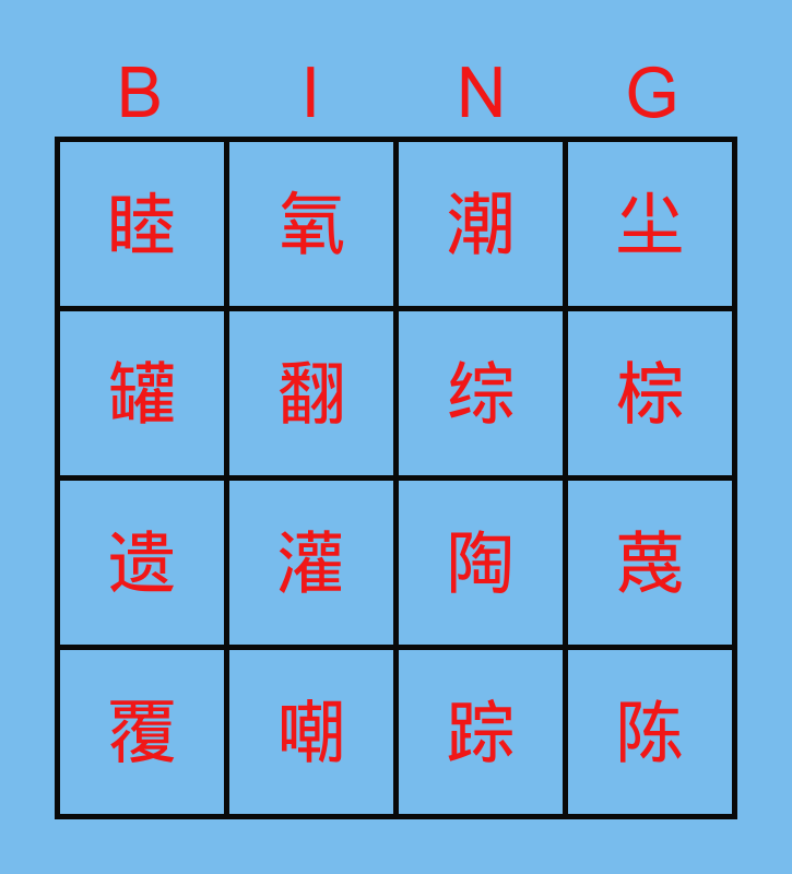 This bingo card has 16 words: 嘲, 蔑, 潮, 睦, 遗, 氧, 陶, 踪, 罐, 翻, 覆, 尘, 灌, 棕, 综 and 陈.