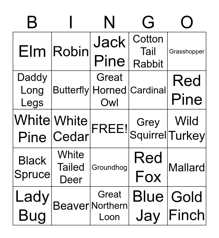 This bingo card has a free space and 60 words: Bald Eagle, Beaver, Black Bear, Black Spruce, Blue Jay, Bumble Bee, Butterfly, Canada Goose, Cardinal, Chickadee, Cotton Tail Rabbit, Crow, Daddy Long Legs, Dragonfly, Earthworm, Elm, Gold Finch, Grasshopper, Great Blue Heron, Great Horned Owl, Grey Squirrel, Jack Pine, Lady Bug, Mallard, Moose, Mourning Dove, Racoon, Red Oak, Red Pine, Red Squirrel, Red Tailed Hawk, Red Winged Black Bird, Ring Billed Gull, Ring Neck Pheasant, Robin, Skunk, Tamarack, White Cedar, White Oak, White Pine, White Spruce, White Tailed Deer, Wild Turkey, Wood Duck, Red Fox, Brown Bat, Chipmunks, Redheaded Woodpecker, Garter Snake, Groundhog, Great Northern Loon, Canada Lynx, Painted Turtle, Snapping Turtle, Gray Wolf, Porcupine, Leopard Frog, Bull Frog, Snowy Owl and Firefly.
