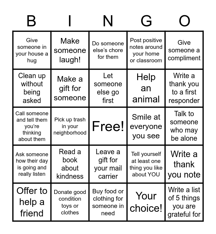 This bingo card has a free space and 24 words: Read a book about kindness, Donate good condition toys or clothes, Let someone else go first, Offer to help a friend, Give someone a compliment, Give someone in your house a hug, Clean up without being asked, Make someone laugh!, Smile at everyone you see, Leave a gift for your mail carrier, Help an animal, Call someone and tell them you’re thinking about them, Tell yourself at least one thing you like about YOU, Write a thank you note, Make a gift for someone, Your choice!, Talk to someone who may be alone, Do someone else’s chore for them, Write a thank you to a first responder, Pick up trash in your neighborhood, Write a list of 5 things you are grateful for, Ask someone how their day is going and really listen, Post positive notes around your home or classroom and Buy food or clothing for someone in need.