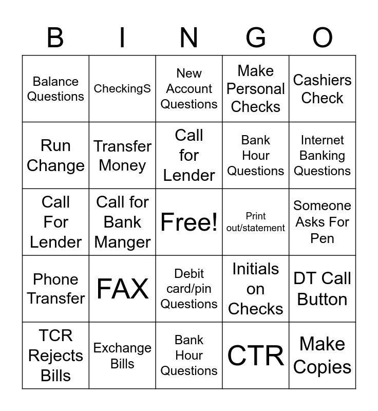 This bingo card has a free space and 24 words: FAX, Exchange Bills, Call for Lender, TCR Rejects Bills, Cashiers Check, Balance Questions, Run Change, CheckingS, Print out/statement, Debit card/pin Questions, Bank Hour Questions, Call For Lender, Initials on Checks, DT Call Button, Transfer Money, CTR, Someone Asks For Pen, New Account Questions, Internet Banking Questions, Call for Bank Manger, Make Copies, Phone Transfer, Make Personal Checks and Bank Hour Questions.