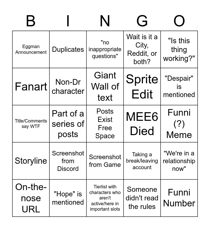 This bingo card has a free space and 24 words: Screenshot from Discord, "Hope" is mentioned, Giant Wall of text, On-the-nose URL, "Is this thing working?", Eggman Announcement, Fanart, Duplicates, MEE6 Died, Screenshot from Game, Sprite Edit, Title/Comments say WTF, Taking a break/leaving account, "We're in a relationship now", Non-Dr character, Someone didn't read the rules, Funni (?) Meme, "no inappropriate questions", "Despair" is mentioned, Part of a series of posts, Funni Number, Storyline, Wait is it a City, Reddit, or both? and Tierlist with characters who aren't active/here in important slots.