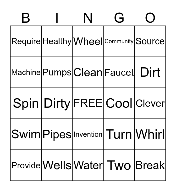 This bingo card has a free space and 24 words: Pipes, Wells, Clean, Provide, Source, Require, Machine, Healthy, Cool, Invention, Faucet, Spin, Turn, Whirl, Pumps, Two, Clever, Wheel, Dirt, Dirty, Break, Swim, Community and Water.