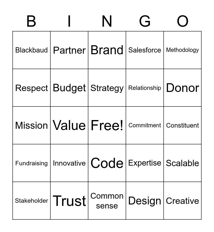 This bingo card has a free space and 30 words: Trust, User Experience, Value, Advancement, Blackbaud, Brand, Budget, Code, Commitment, Common sense, Constituent, Creative, Design, Diversity, Donor, Expert Access, Expertise, Fundraising, Innovative, Methodology, Mission, Nimble, Partner, Relationship, Respect, Salesforce, Scalable, Stakeholder, Strategy and Technology.