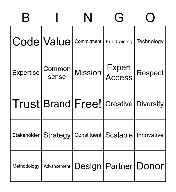 This bingo card has a free space and 30 words: Advancement, Blackbaud, Brand, Budget, Code, Commitment, Common sense, Constituent, Creative, Design, Diversity, Donor, Partner, Relationship, Respect, Salesforce, Scalable, Stakeholder, Strategy, Technology, Trust, User Experience, Value, Expert Access, Expertise, Fundraising, Innovative, Methodology, Mission and Nimble.