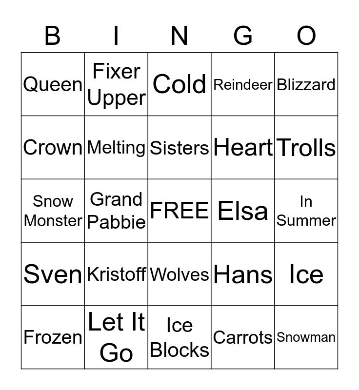This bingo card has a free space and 36 words: Sled, Olaf, Snow, Melting, Hans, Sven, Sisters, Duke, Blizzard, Snowflake, Grand Pabbie, Reindeer, Anna, Elsa, Trolls, Queen, Princess, Kristoff, Snowman, Cold, In Summer, Ice, Let It Go, Frozen, Ice Blocks, Fixer Upper, Snow Monster, Marshmallow, Heart, Crown, Castle, Freezing, Carrots, Wolves, Warm Hugs and Ice Skating.