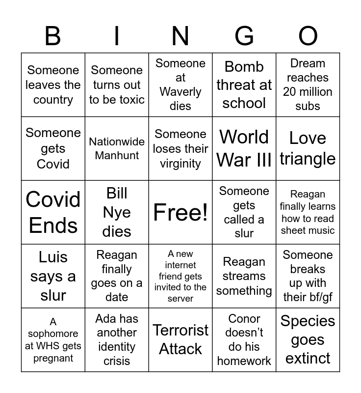 This bingo card has a free space and 24 words: Reagan finally goes on a date, Ada has another identity crisis, Someone loses their virginity, A sophomore at WHS gets pregnant, Dream reaches 20 million subs, Someone leaves the country, Someone gets Covid, Someone turns out to be toxic, Someone gets called a slur, A new internet friend gets invited to the server, World War III, Covid Ends, Reagan streams something, Someone breaks up with their bf/gf, Nationwide Manhunt, Conor doesn’t do his homework, Reagan finally learns how to read sheet music, Someone at Waverly dies, Love triangle, Bill Nye dies, Species goes extinct, Luis says a slur, Bomb threat at school and Terrorist Attack.