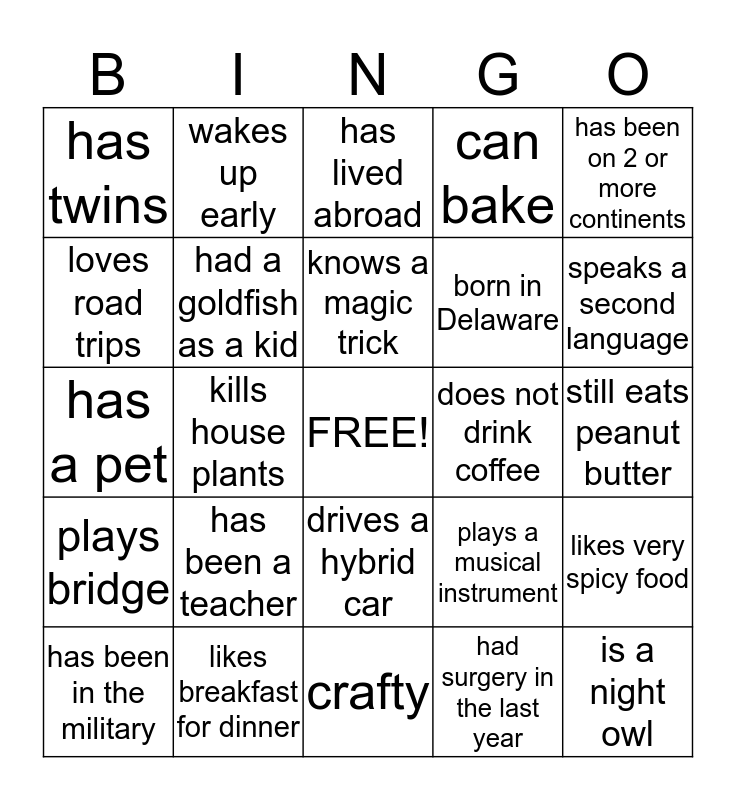 This bingo card has a free space and 24 words: has been a teacher, likes breakfast for dinner, knows a magic trick, has been in the military, has been on 2 or more continents, has twins, loves road trips, wakes up early, does not drink coffee, drives a hybrid car, born in Delaware, has a pet, plays a musical instrument, likes very spicy food, had a goldfish as a kid, had surgery in the last year, still eats peanut butter, has lived abroad, speaks a second language, kills house plants, is a night owl, plays bridge, can bake and crafty.