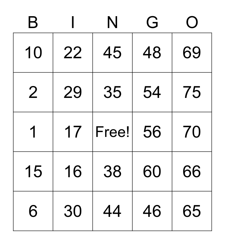 This bingo card has a free space and 24 words: 6, 16, 35, 46, 69, 10, 22, 45, 56, 70, 1, 29, 60, 66, 2, 30, 44, 48, 75, 15, 17, 38, 54 and 65.