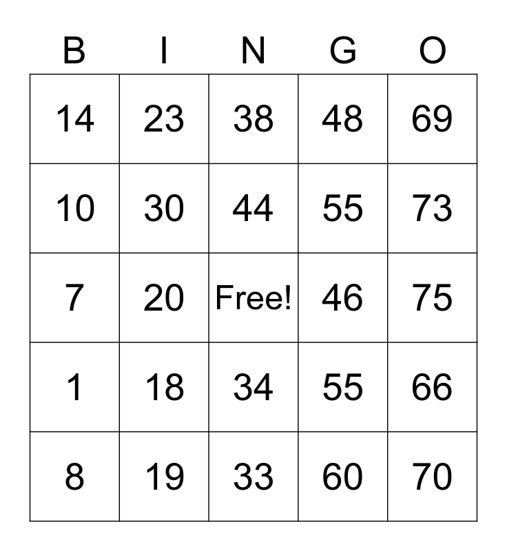 This bingo card has a free space and 24 words: 8, 18, 44, 60, 69, 14, 23, 38, 46, 75, 7, 30, 55, 66, 10, 19, 33, 48, 73, 1, 20, 34, 55 and 70.