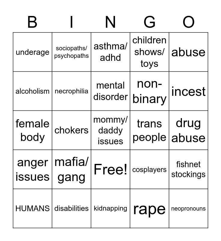 This bingo card has 26 words: Free!, rape, mental disorder, disabilities, abuse, underage, alcoholism, sociopaths/ psychopaths, drug abuse, cosplayers, non-binary, female body, fishnet stockings, HUMANS, chokers, cross- dressing, children shows/ toys, anger issues, asthma/ adhd, mommy/ daddy issues, incest, kidnapping, trans people, mafia/ gang, necrophilia and neopronouns.