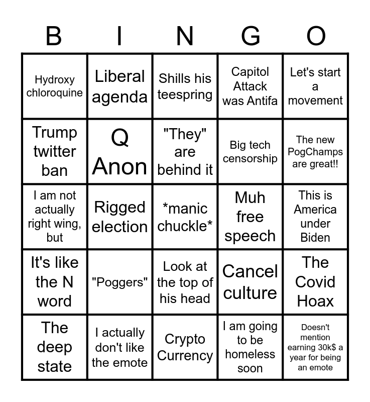 This bingo card has 25 words: It's like the N word, I actually don't like the emote, *manic chuckle*, I am going to be homeless soon, Let's start a movement, Hydroxy chloroquine, Liberal agenda, Shills his teespring, Muh free speech, The Covid Hoax, Trump twitter ban, Q Anon, Crypto Currency, Cancel culture, The new PogChamps are great!!, The deep state, Rigged election, "They" are behind it, Big tech censorship, This is America under Biden, I am not actually right wing, but, "Poggers", Look at the top of his head, Capitol Attack was Antifa and Doesn't mention earning 30k$ a year for being an emote.