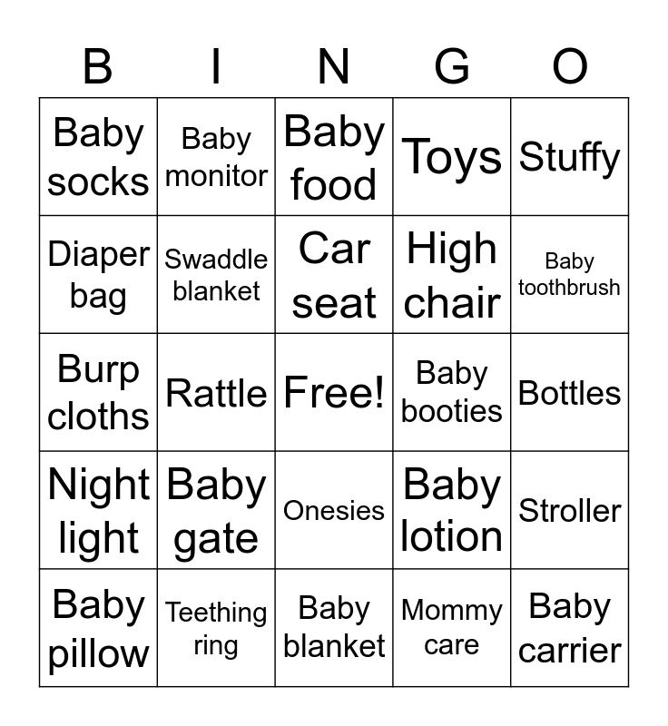 This bingo card has a free space and 25 words: Baby gate, Baby blanket, Car seat, Baby pillow, Stuffy, Baby socks, Diaper bag, Baby monitor, Baby booties, Onesies, High chair, Burp cloths, Baby lotion, Stroller, Swaddle blanket, Crib, Bottles, Baby food, Baby toothbrush, Rattle, Baby carrier, Teething ring, Night light, Toys and Mommy care.