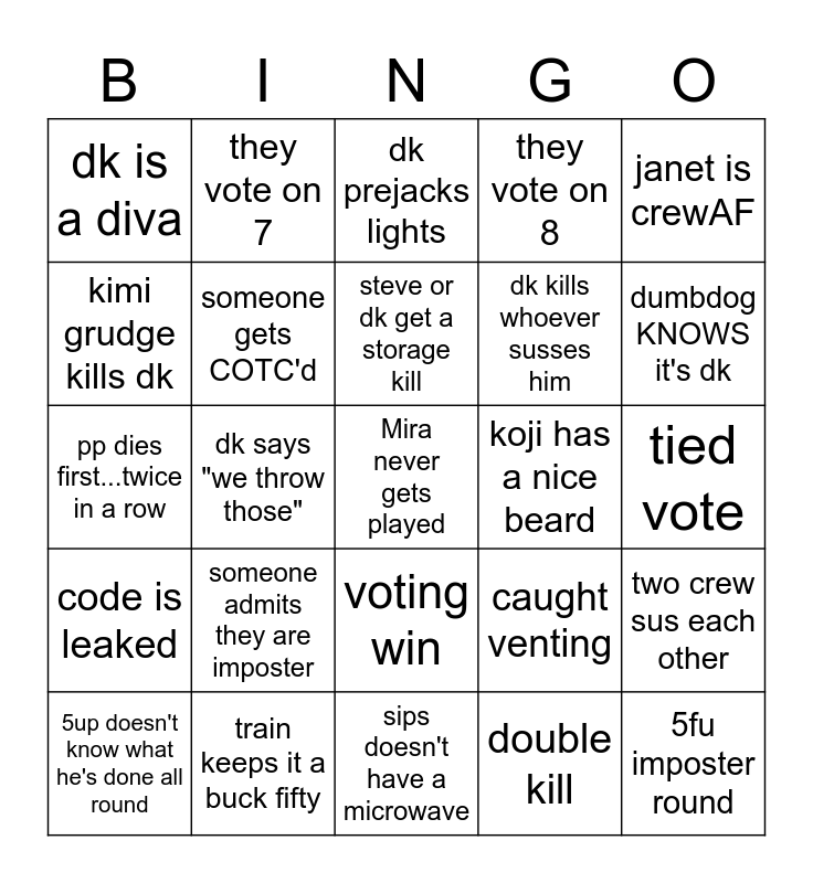 This bingo card has a free space and 75 words: the streamer you are watching dies first, steve is in speci, he's a really good guy, dk prejacks lights, someone makes a freudian slip, steve is a little rat boi, 5up is late to the lobby, 5up says he's a really good guy, he isn't, 5up does the same download as Hafu and she hates it, aipha...aipha's (you'll know it when you see it), dumbdog gets framed, wolf kills off cooldown, pp dies left side on skeld, steve or dk get a storage kill, kimi grudge kills dk, kimi says "oh my lonta", dk says "we throw those", dumb and dumber imposter round, 5fu imposter round, 1v7 clutch, janet is crewAF, chat gets salty about meta-ing, pp dies first...twice in a row, someone gets COTC'd, they vote on 7, they vote on 8, they vote on 9, bad button, Talia can't be bothered, self-report, sneaky kill, weird pathing sus, miss cleared *smirks*, 2 crew catch an imposter, caught venting, dumbdog KNOWS it's dk, dk kills whoever susses him, early reactor call, wolf is afk to start, tied vote, double kill, "valley of death" versus "death valley" confusion, someone is eating, tarky warky propaganda, everyone's accounted for, dumbdog has no info, steve pre-runs to cams, 5up doesn't know what he's done all round, dk is a diva, desync fucks everything, ghosts hold tasks, task win, voting win, imposter kill win, welcome new fill!, 1 imposter frames the other, 5up clears someone for no apparent reason, hafu says "am i crazy?" trying to decide how hard to sus someone, wolf or talia do an American accent, steve does a scottish accent, smajor has admin/vitals info, someone admits they are imposter, steve never susses 5up, kimi self reports, wolf is a self-proclaimed admin andy, hafu has finished all her tasks *smile*, koji has a nice beard, koji is innocent but gets voted out, dk says "send it", janet says "spicy boom", two crew sus each other, code is leaked, train keeps it a buck fifty, aipha thinks he is train, sips doesn't have a microwave and someone has to brb to get their food.